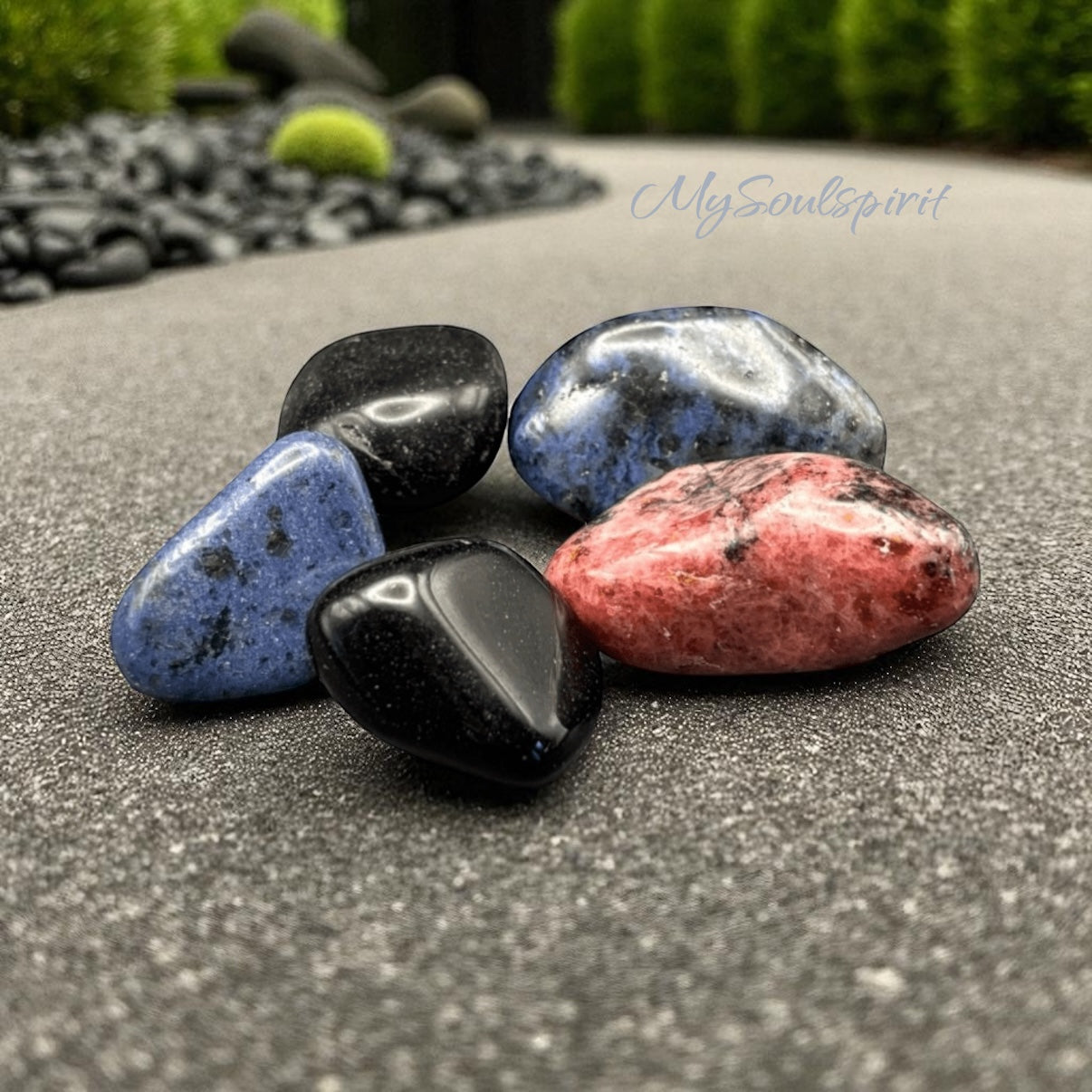 Trommelstein-Set Rhodonit, Sugilith & Obsidian – Symbolische Begleiter