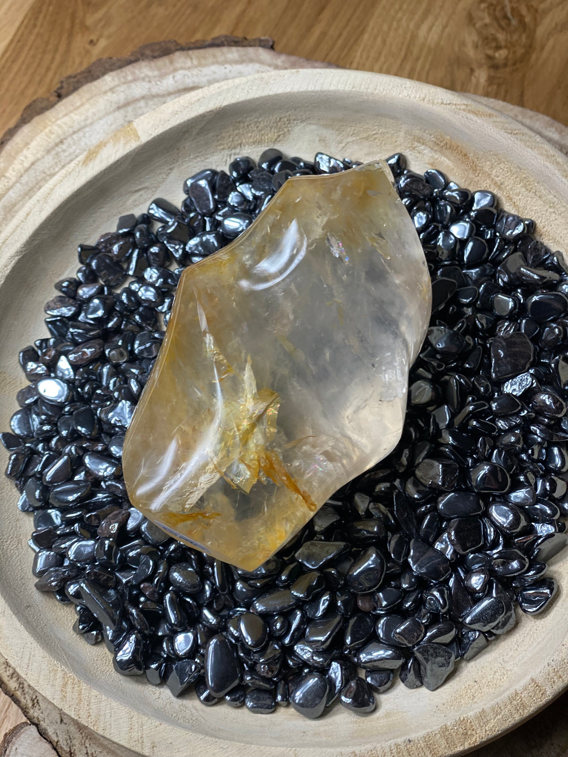 Du bekommst zwei Säckchen gefüllt mit 200 gr. Hämatit Trommelsteine zur Reinigung und 140 gr. Bergkristall Trommelsteine zum Laden von Heilsteinen.